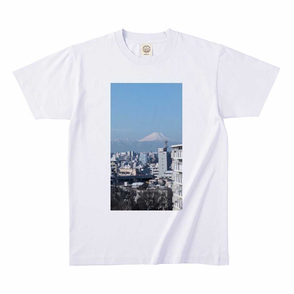 地球にも肌にも優しいオーガニックコットン100%のTシャツ。東京の中心・新宿から撮った富士山の写真を前面にプリントしてみました。